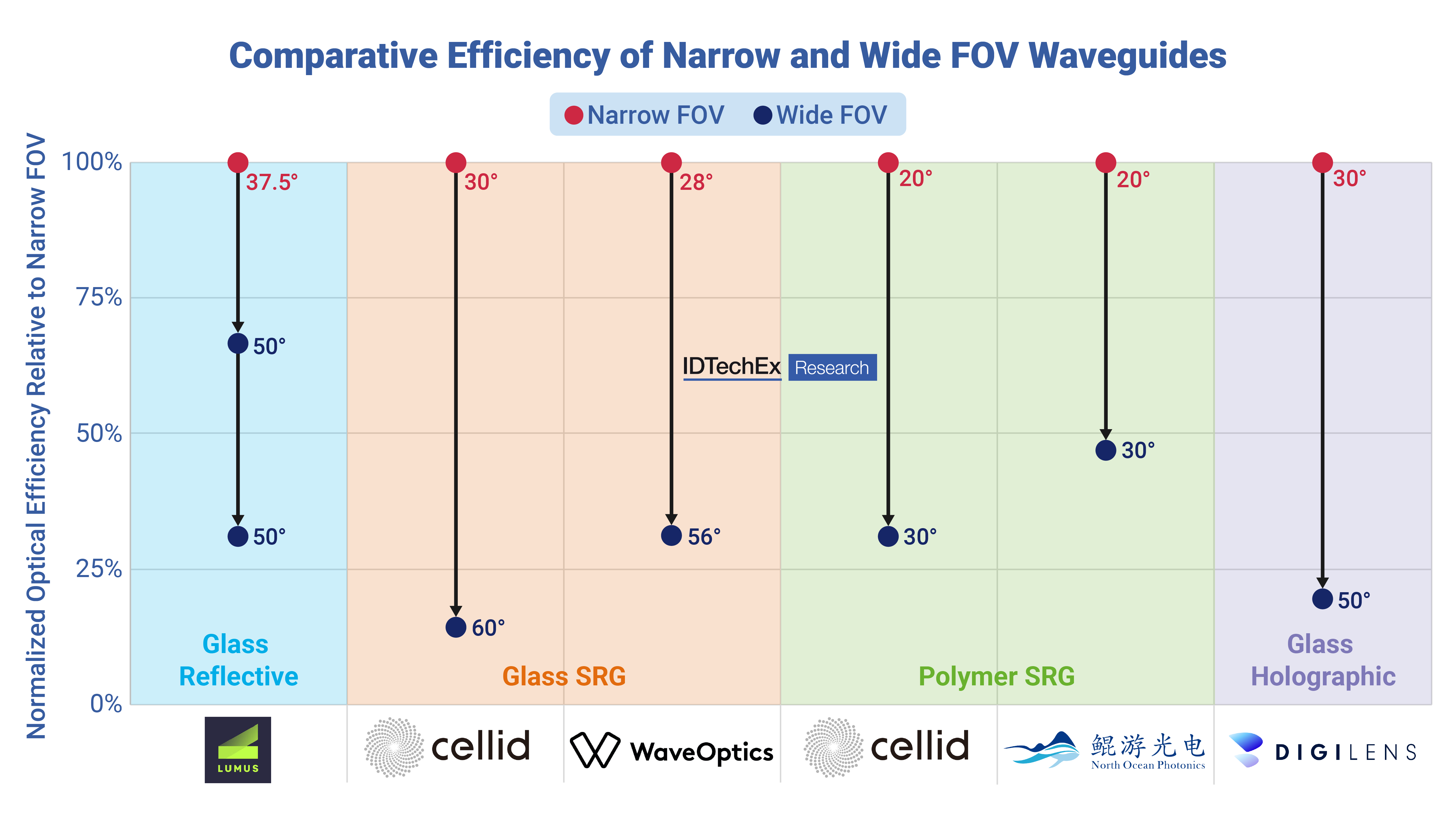The difference in optical efficiency at wider FOV for the same technology type for several commercial waveguides. Data was normalized to the narrow FOV product, with arrows representing the reduction in efficiency for wide FOV waveguides developed by the same company. A clear reduction in optical efficiency for waveguides of the same technology at wider FOV is observed. Source: IDTechEx.