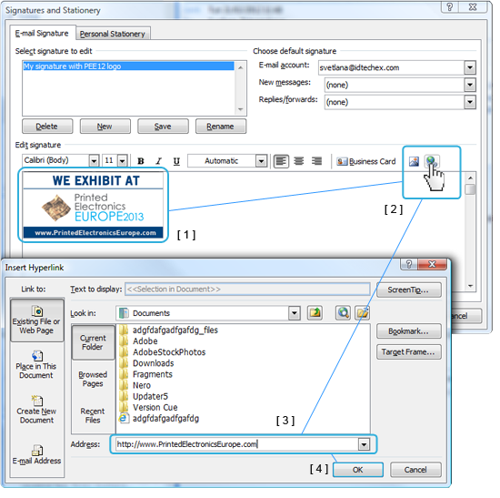 Click the banner image to select it. [1] Click the "link" icon [2] Type the conference web-address in the address box [3] (! Important: Always begin with http://www) Click Ok to apply your changes and close all dialog windows.[4] |