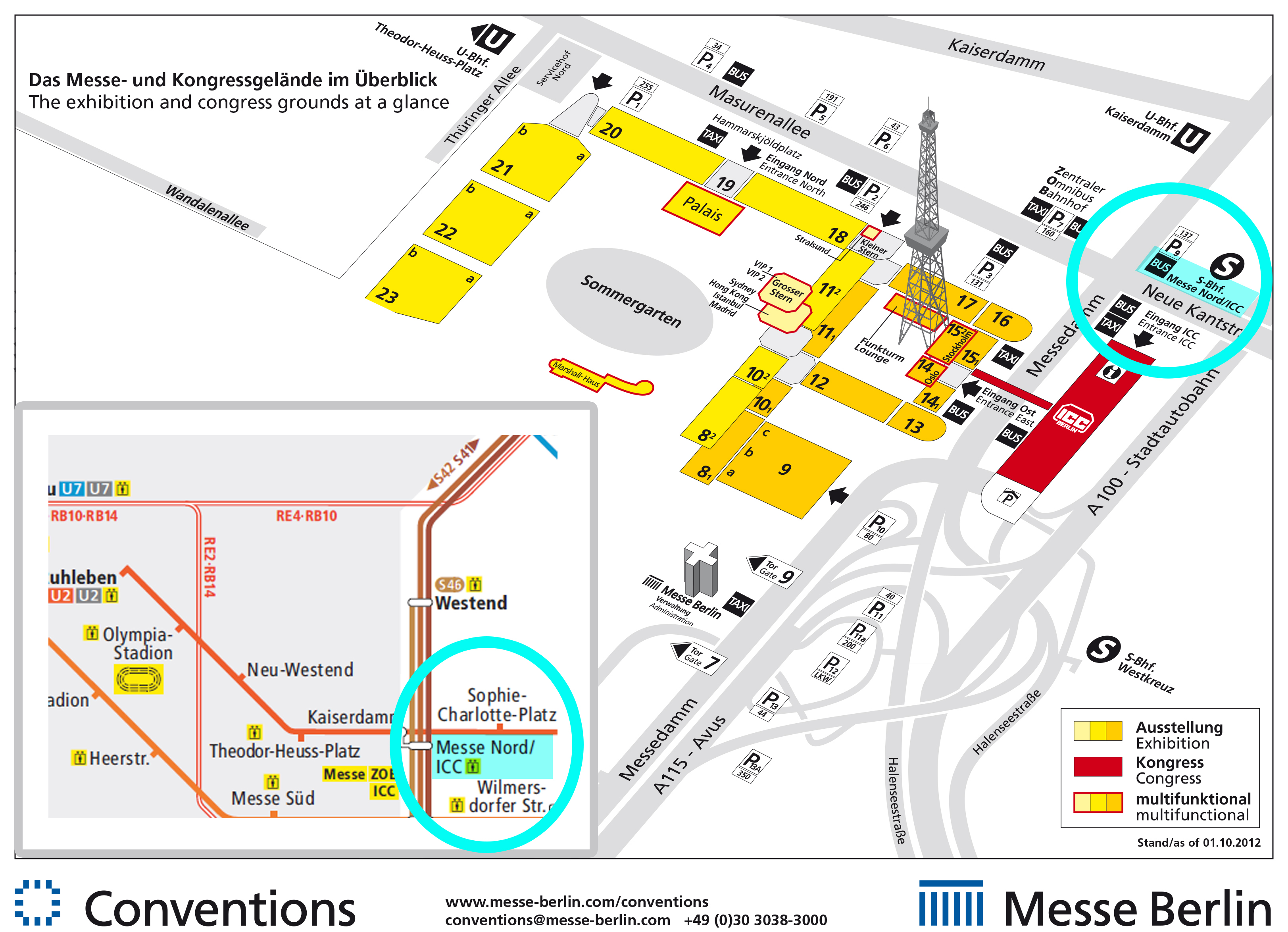 The nearest S-Bahn-Station is "Messe Nord / ICC" - S41 / S42. The nearest U-Bahn-Station is "Kaiserdamm" - U2.